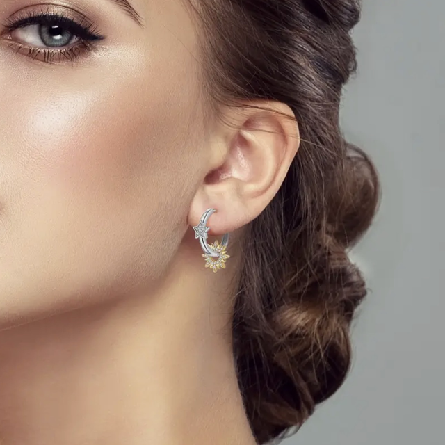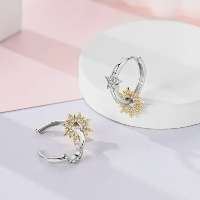 These silver hoops feature a celestial mix of a sparkling moon on one and a star on the other. Each hoop is accented with a matching gold, crystal-studded sunburst, creating a playful two-tone look that’s whimsical, modern, and eye-catching.
