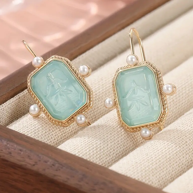 Each drop earring features a light blue synthetic gemstone, intricately engraved with a bow and arrow motif. The golden-tone setting has a rope-effect border, adding texture and old-world charm. Surrounding the design are delicate pearl details—enhancing the ornate, handcrafted look.