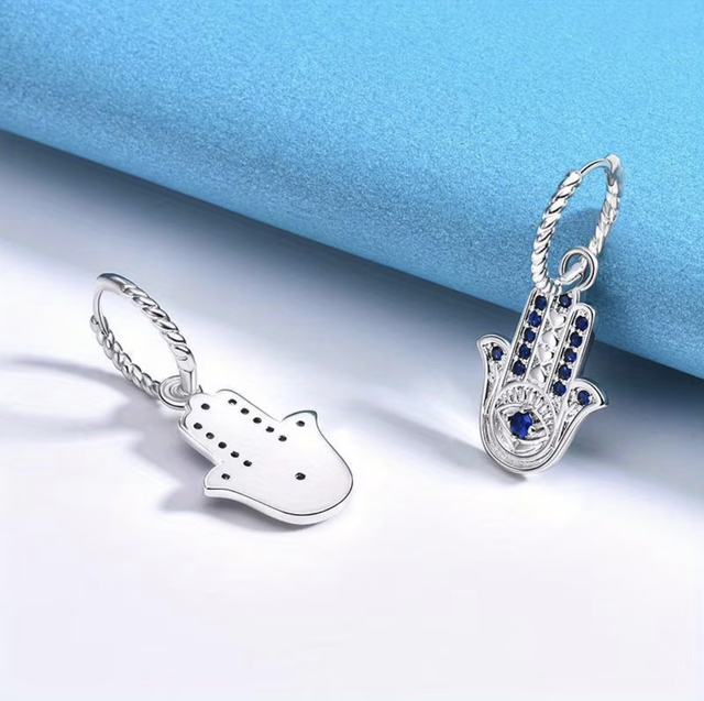These elegant earrings feature platinum-plated twisted hoop huggies paired with detailed Hamsa hand charms. Each charm is adorned with deep blue round stones, arranged in vertical rows along the fingers and centred within an intricately carved evil-eye motif at the base.