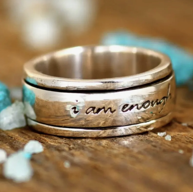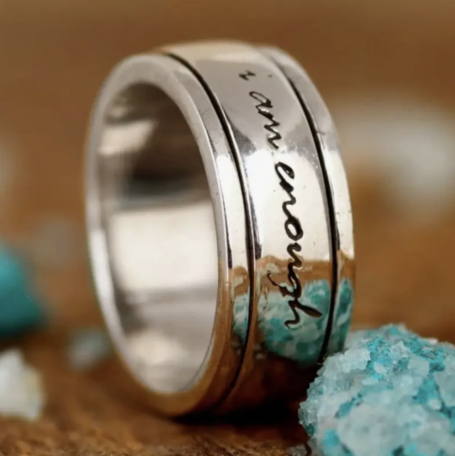 A sleek white K-gold ring featuring a smooth, polished band with boarder. Engraved in delicate handwritten script with the affirmation “I am enough,” this minimalist unisex piece makes a meaningful everyday accessory or gift.