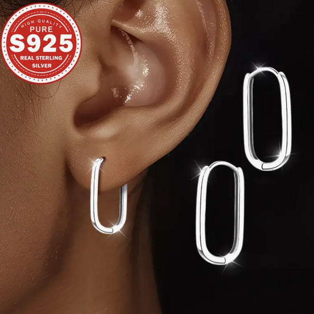 Sleek, rectangular sterling silver hoop earrings. The elongated shape is similar to a rectangle with soft corners.