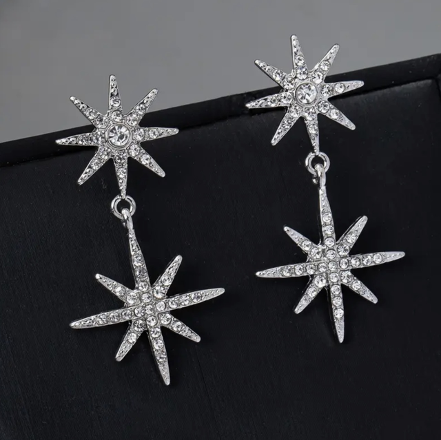 Silver starburst pendant, covered in sparkling crystals and suspended from a matching sterling silver jewelled stud for added shine, creating a striking yet elegant statement that catches the light beautifully.