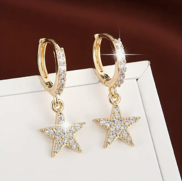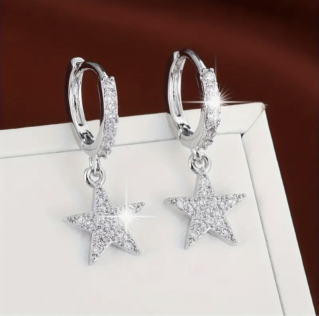 Sparkling star charms, encrusted with Cubic Zirconia, hang from jewelled huggie hoops. Dainty enough for every day wear and perfect for the Christmas party season.