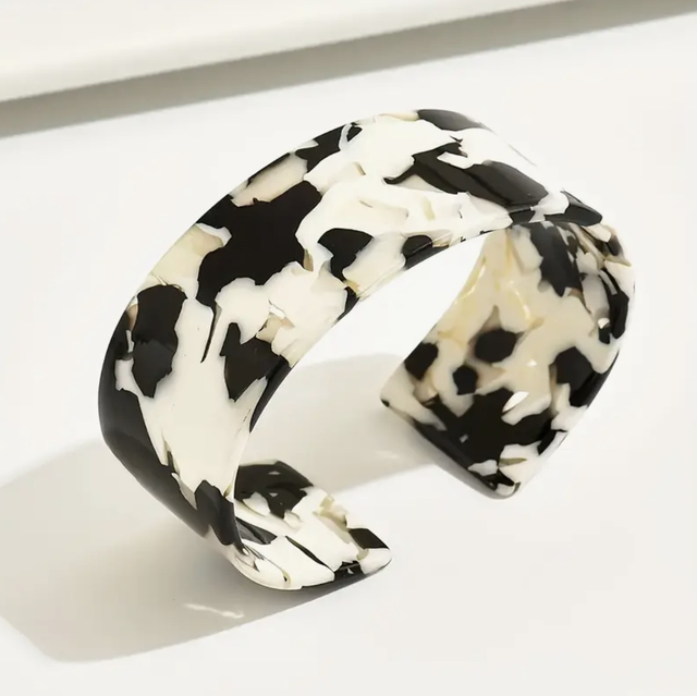 Sleek and modern, this black and white acrylic cuff bracelet features a bold marbled design that makes every piece unique.