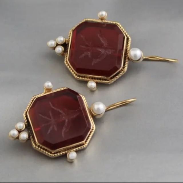 Each earring features a scarlet red synthetic gemstone, intricately engraved with a bow and arrow motif. The golden-tone setting has a rope-effect border, adding texture and old-world charm. Surrounding the design are delicate pearl details—enhancing the ornate, handcrafted look.