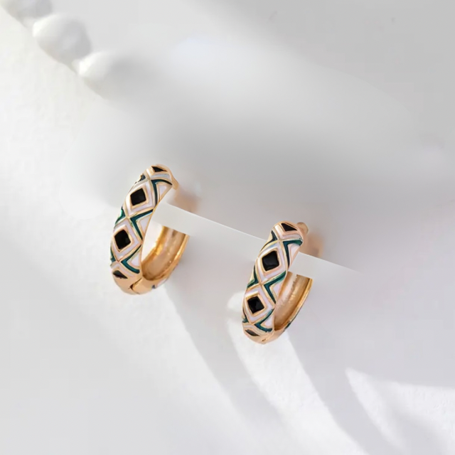 Gold hoop earrings with an enamelled inlay in a choice of patterns . Approx diameter of 2cm.