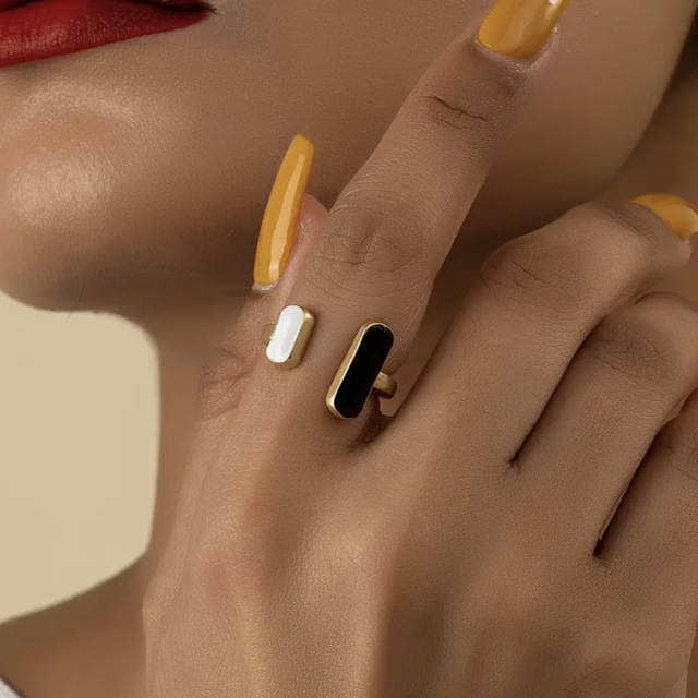 18k gold plated adjustable ring featuring sleek black and white enamelled rectangles. Perfect for casual or party wear!