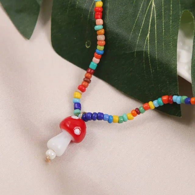 Featuring a miniature glass mushroom pendant with a glossy red cap dotted with white spots and a smooth white stem suspended on a beaded rainbow necklace.